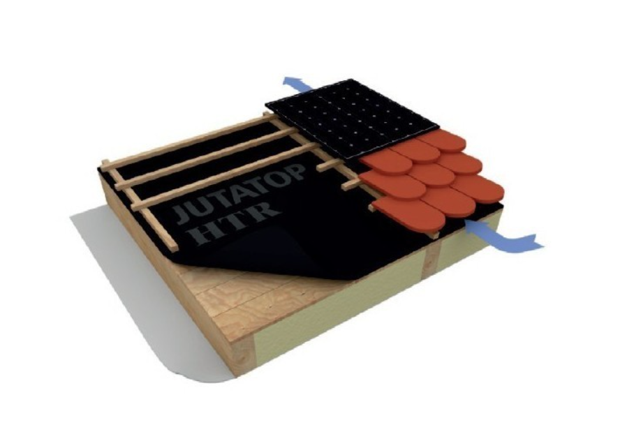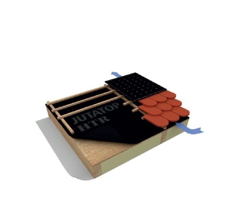 Popis a použití: Juta Jutatrop HTR 2AP® je podstřešní membrána (DHV) s integrovanou dvojitou spojovací páskou. Je vhodná pod integrované fotovoltaické panely i pro nízké sklony šikmých střech. Tato vysoce UV stabilní membrána je vhodná také do větraných fasád s obkladem s otevřenou spárou do 50 mm a max. 50 % odkrytí z plochy fasády. Membrána je vhodná i pro případ použití integrovaných fotovoltaických panelů na větrané fasádě. Reakce na oheň B a minimální sklon použití je 5° při dodržení montážních dispozic.