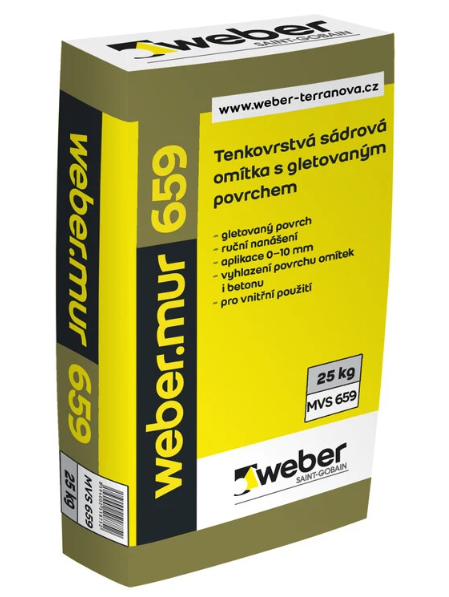 Použití: Weber mur 659 je určen pro vnitřní prostory, na sádrové bázi. Ruční zpracování. Produkt lze použít jako tenkovrstvá vyhlazovací omítka stěn a stropů. Malta je vhodná na omítky i beton.