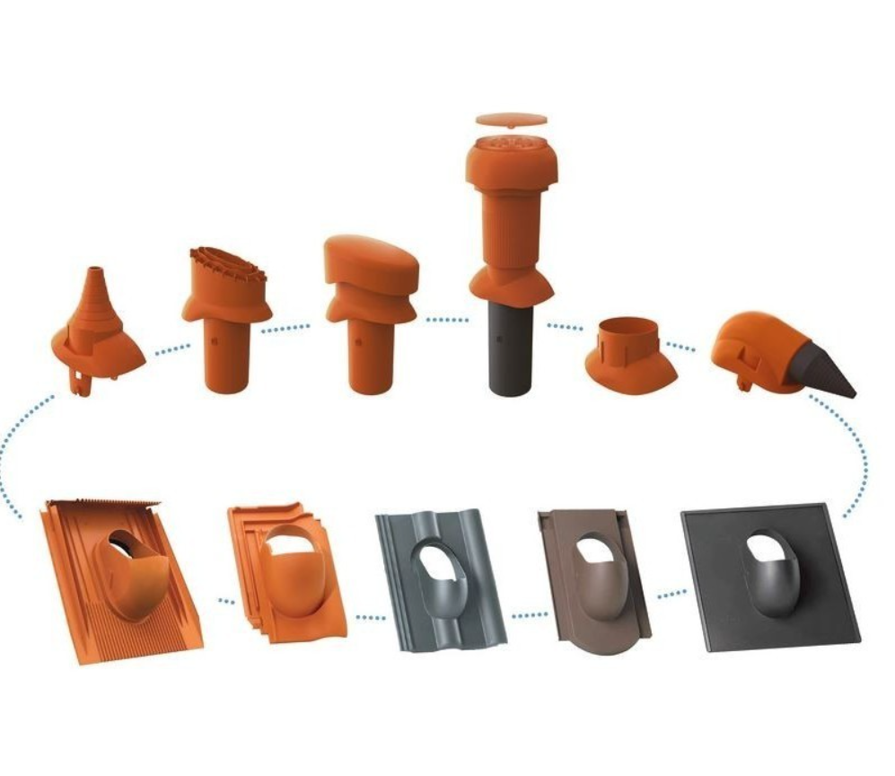 Popis a použití: Základní prostupové tašky jsou vyrobeny podle tvaru a zámku konkrétního typu střešní krytiny, společně s příslušenstvím slouží pro kompaktní, vodotěsné řešení odvětrání, anténní prostup, prostup pro solární systémy nebo pro vývod odkouření turbokotle. Materiál - ASA (acrylonitrile styrene acrylate) je termoplast, který vyniká vysokou mechanickou pevností, odolností vůči UV záření, odolností proti vodě a vysokou rozměrovou stabilitou.
