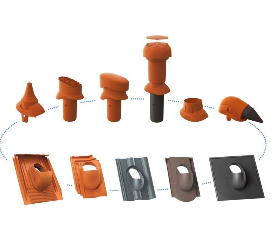 Popis a použití: Základní prostupové tašky jsou vyrobeny podle tvaru a zámku konkrétního typu střešní krytiny, společně s příslušenstvím slouží pro kompaktní, vodotěsné řešení odvětrání, anténní prostup, prostup pro solární systémy nebo pro vývod odkouření turbokotle. Materiál lakovaný ABS (acrylonitrile butadiene styrene) je tuhý, houževnatý termoplast s odolný vůči vodě a teplotním výkyvům