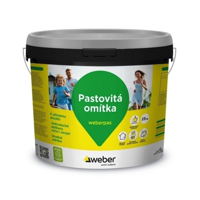 Popis produktu: Weberpas silikon je jednoduše zpracovatelná probarvená pastovitá omítka obsahující organické pojivo a silikonovou disperzi. Omítka je připravená k přímému použití se systémovou penetrací Weberpas podklad UNI.